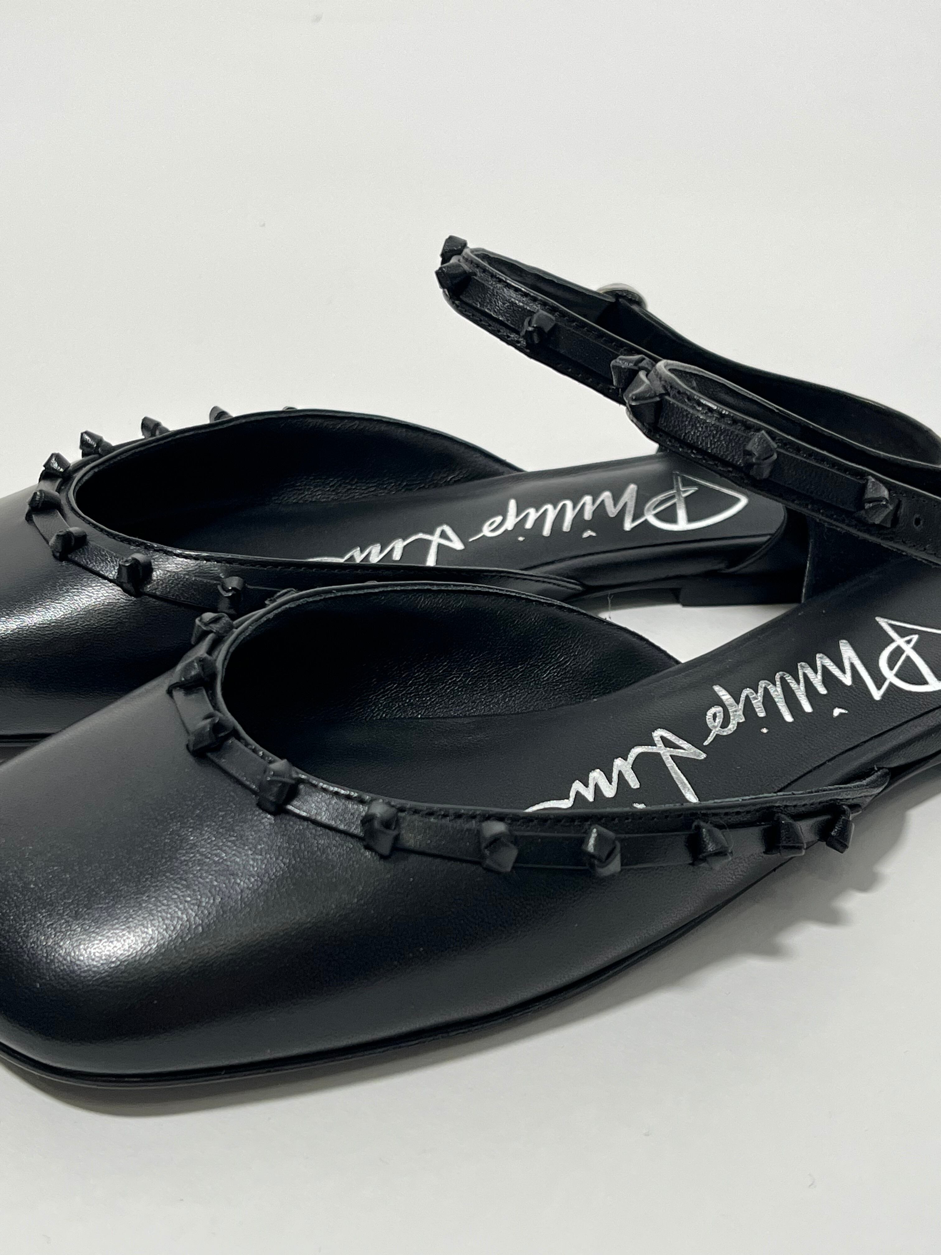 スクエアのつま先とクレセントヒール(三日月型)が特徴的な「ID」メアリージェーンフラットシューズ。レザーの紐を手作業で織り模様をデザインがアクセントに。