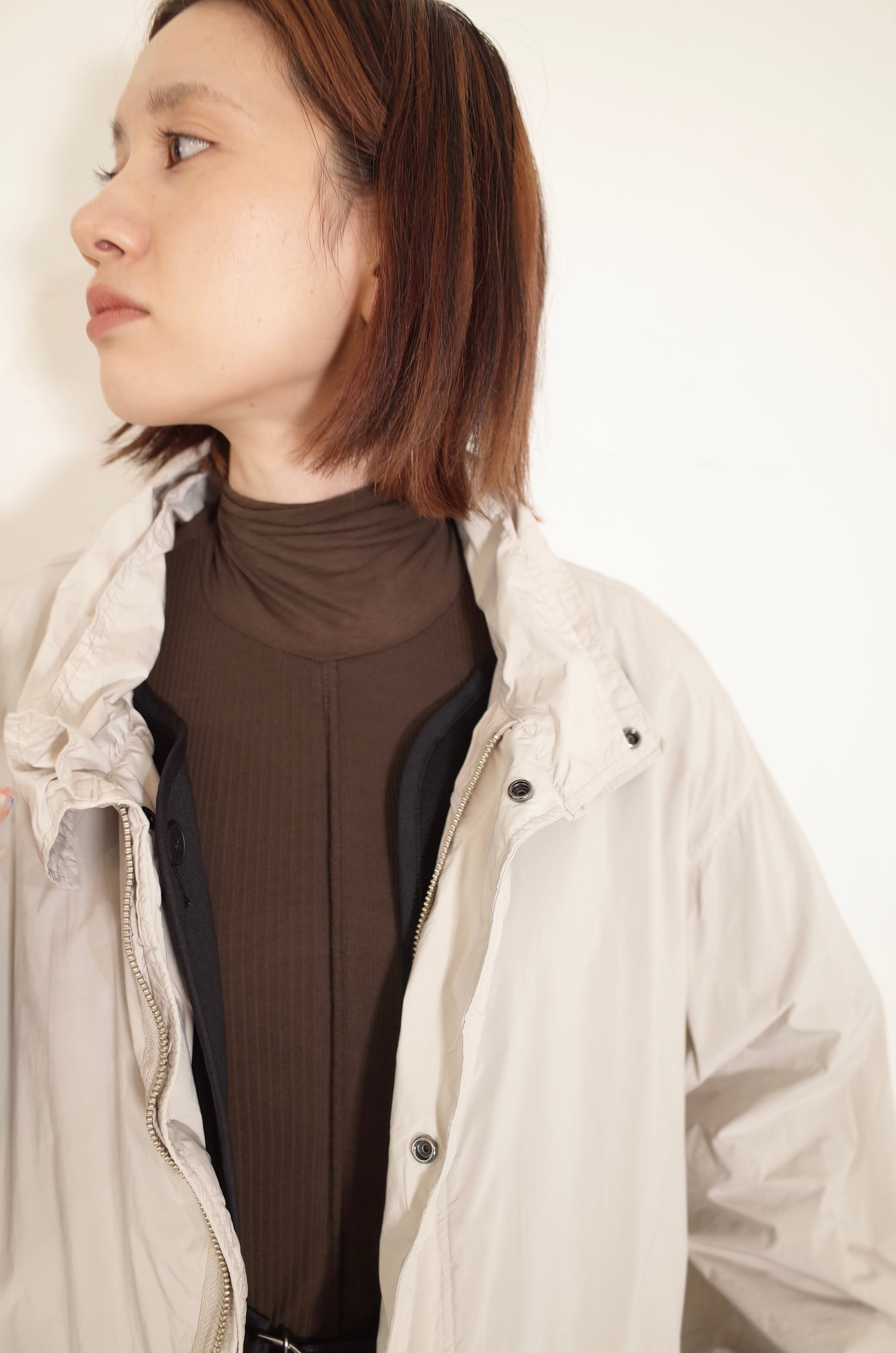 ナイロンとポリエステルの熱収縮率の違いを生かし、環境の変化により表情が変わっていく様を楽しむことのできる、天然繊維のような糸を使用し、石川県能美市にて高密度に織り込むことにより、独特の風合いを表現した素材です。製品染めで仕上げ、撥水加工を施しています。ライナーはしっかりと保温性が伴うので、真冬でも着用することができます。