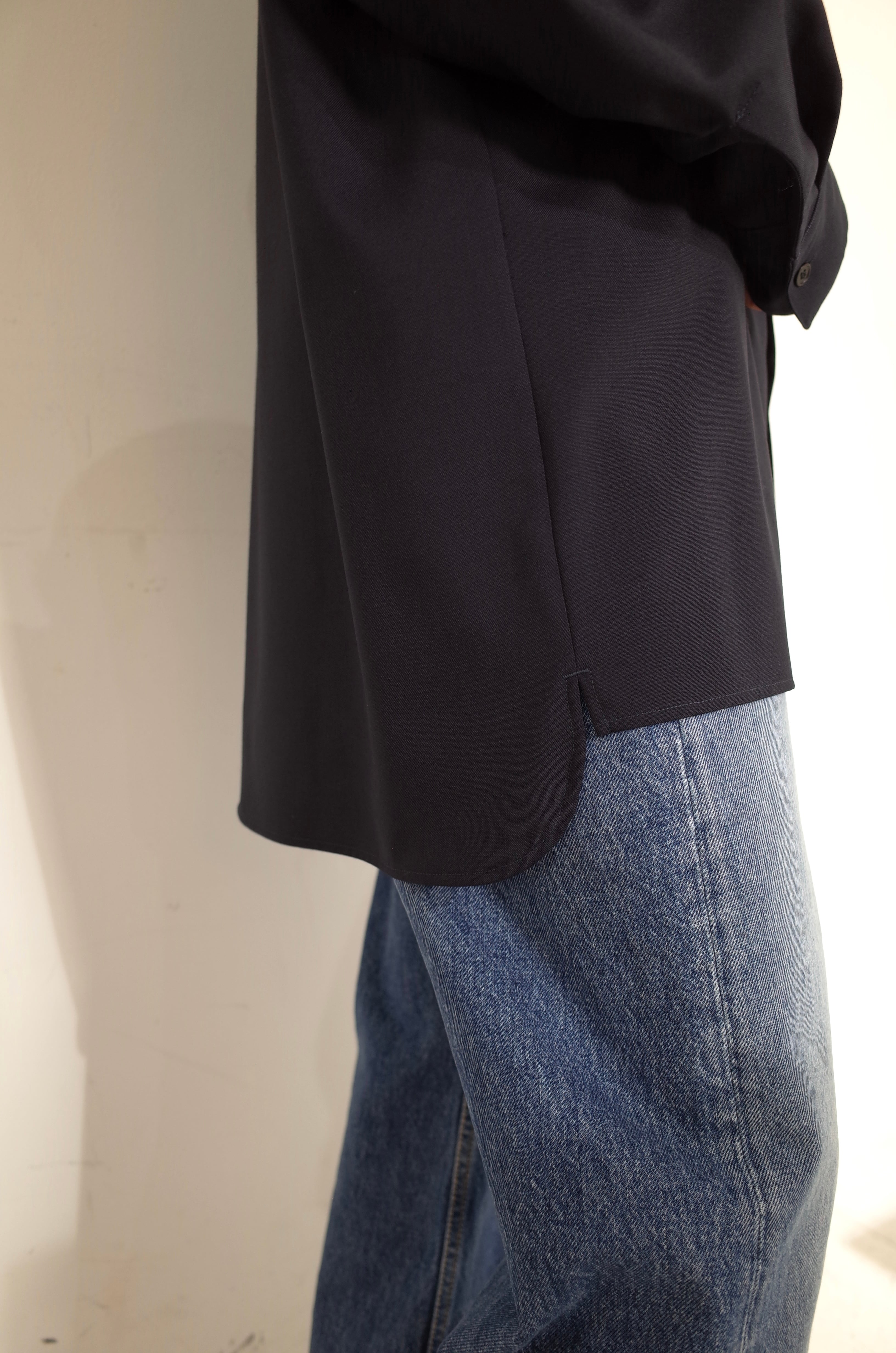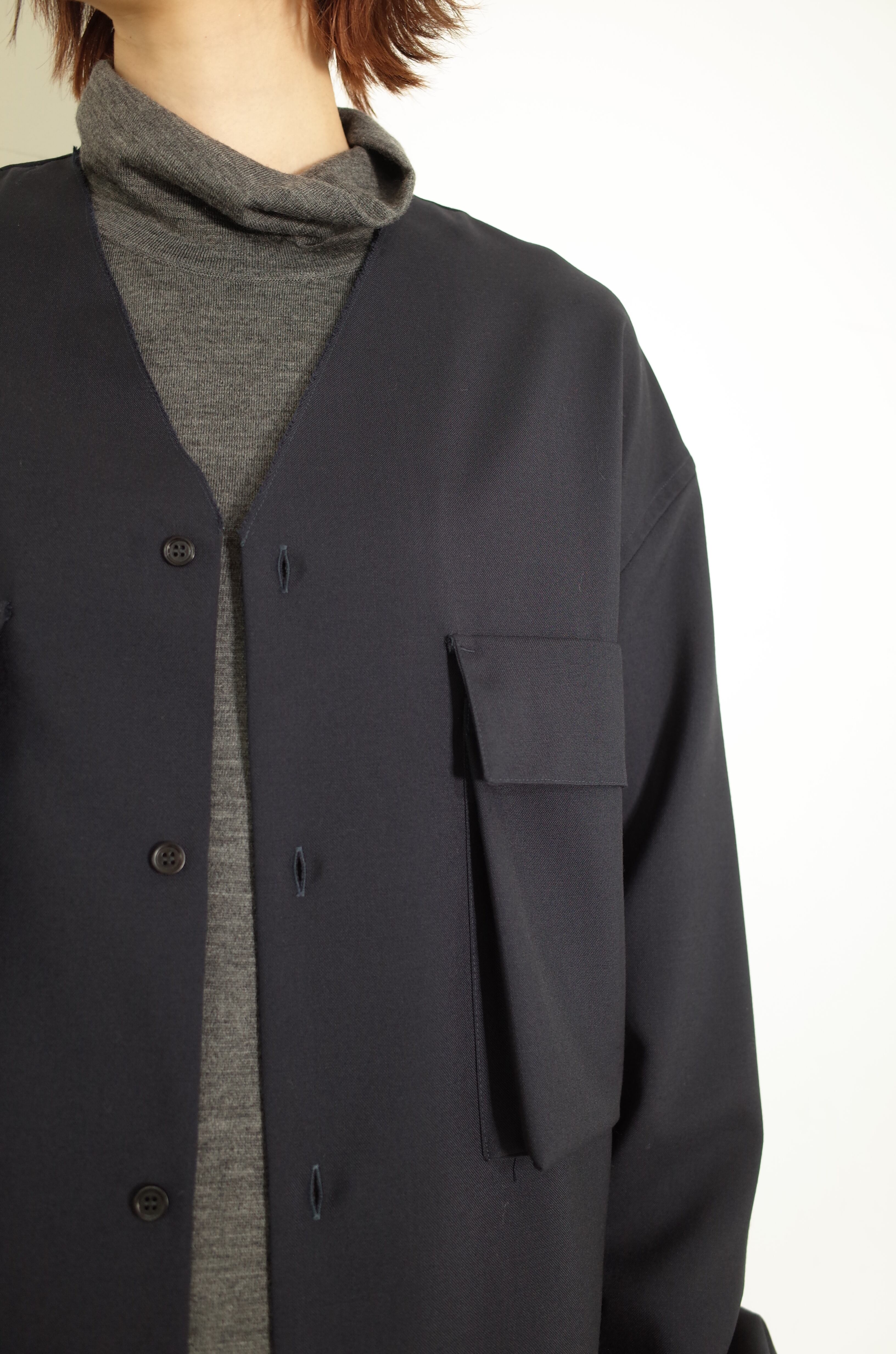 ノーカラーとなる襟元は切りっぱなしになっておりこなれ感UP。