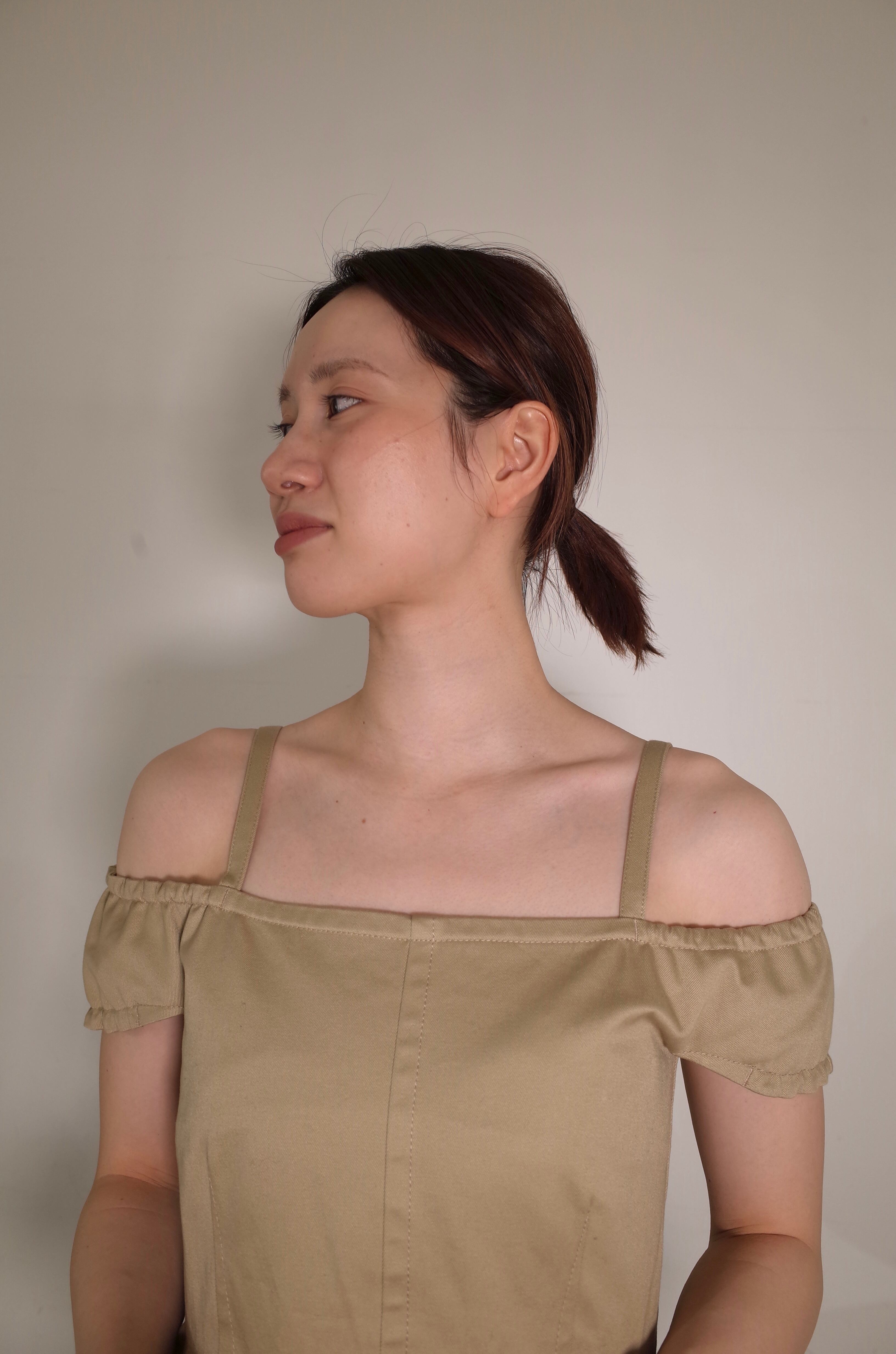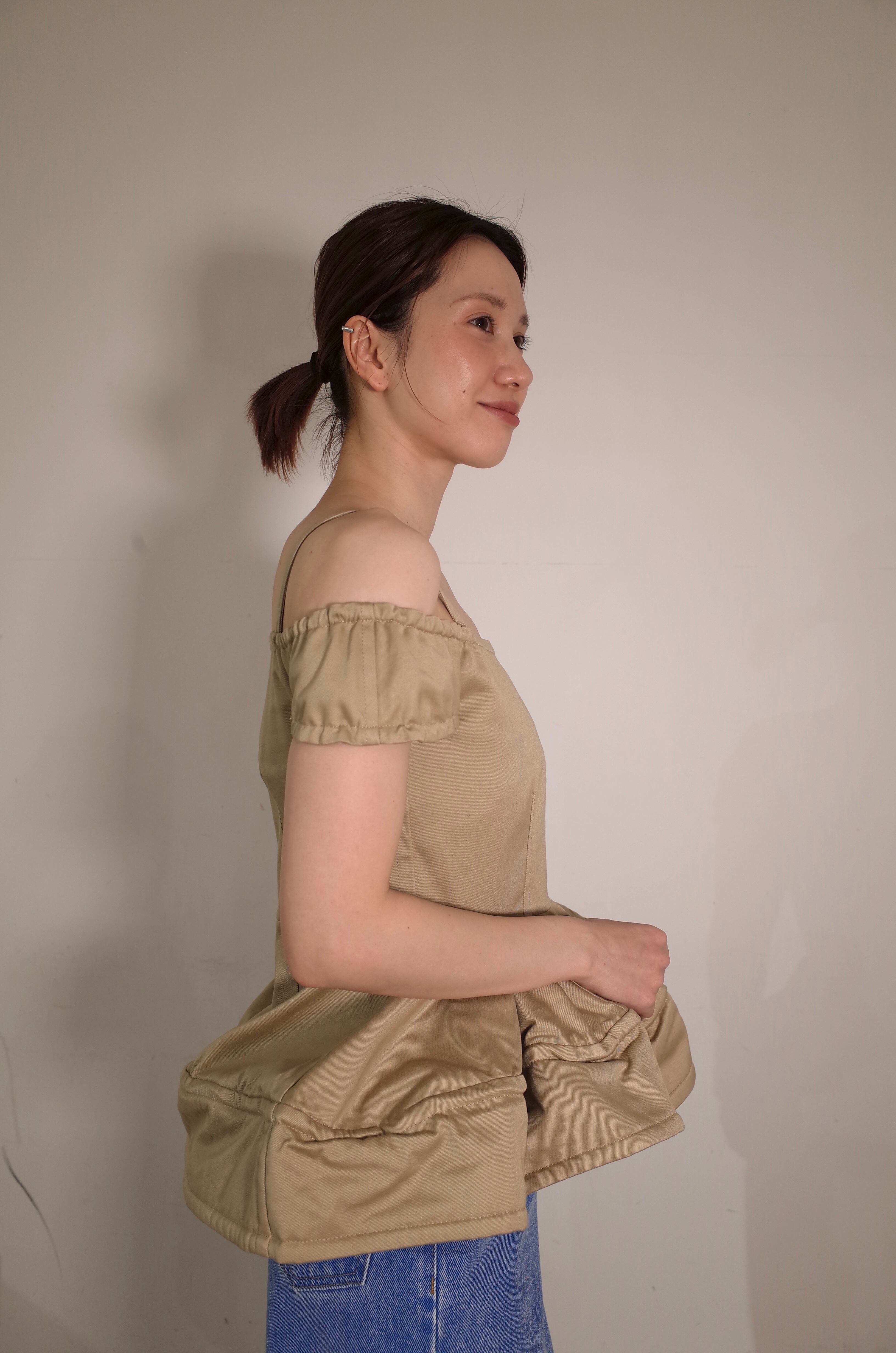 フリルのように広がる裾部分にはワイヤーが仕込まれており、自由自在にシルエットが変えられる仕様に。オフショルダーとして一枚で着用はもちろん、インナーを合わせたレイヤードスタイルも。キャミソール部分に施されているボタンで着丈の調節も可能です。