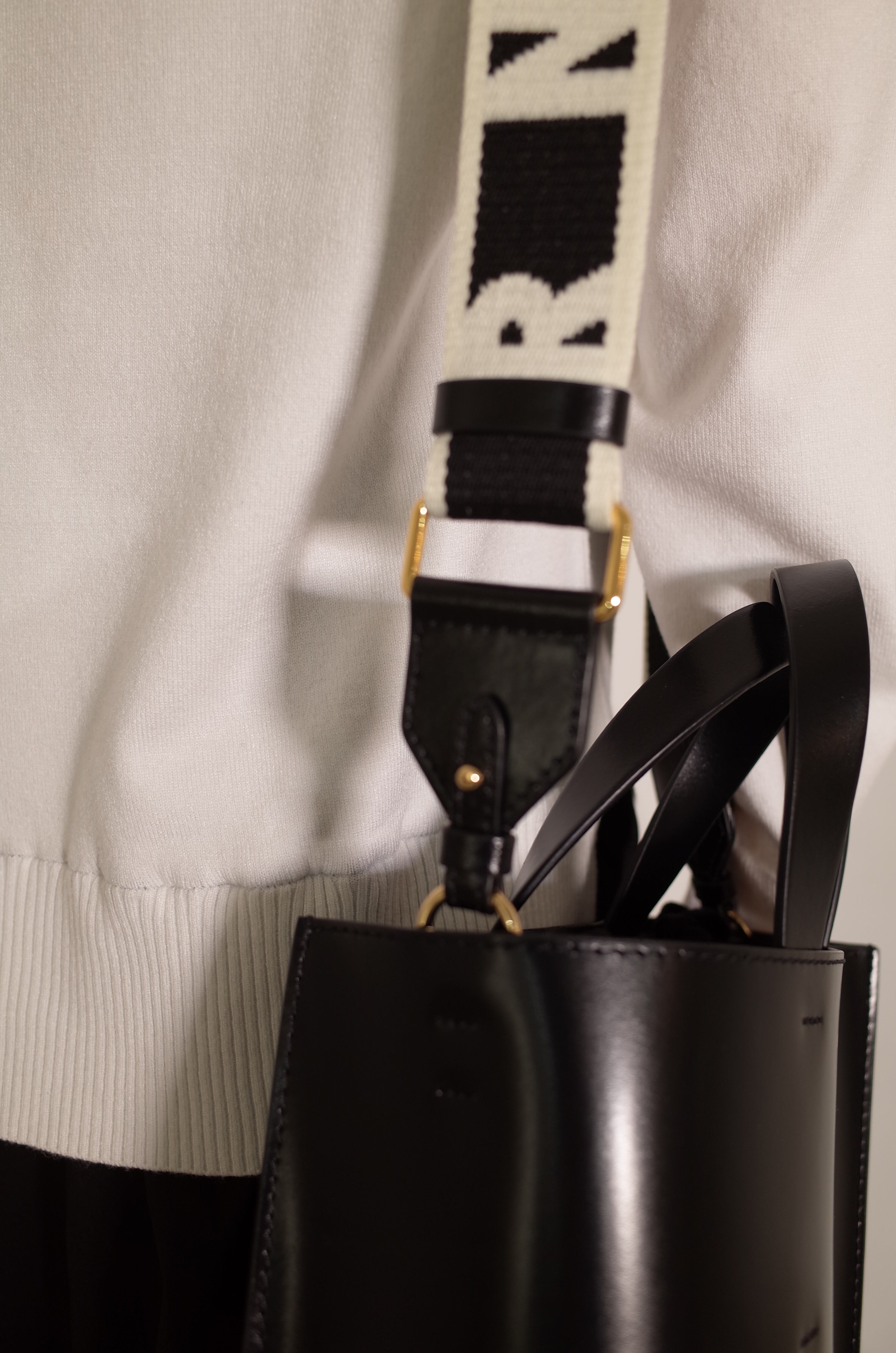 取り外し・調整可能なリサイクルテープ製ブラック×アイボリーカラーのロゴショルダーストラップはコーディネートのアクセントに。
