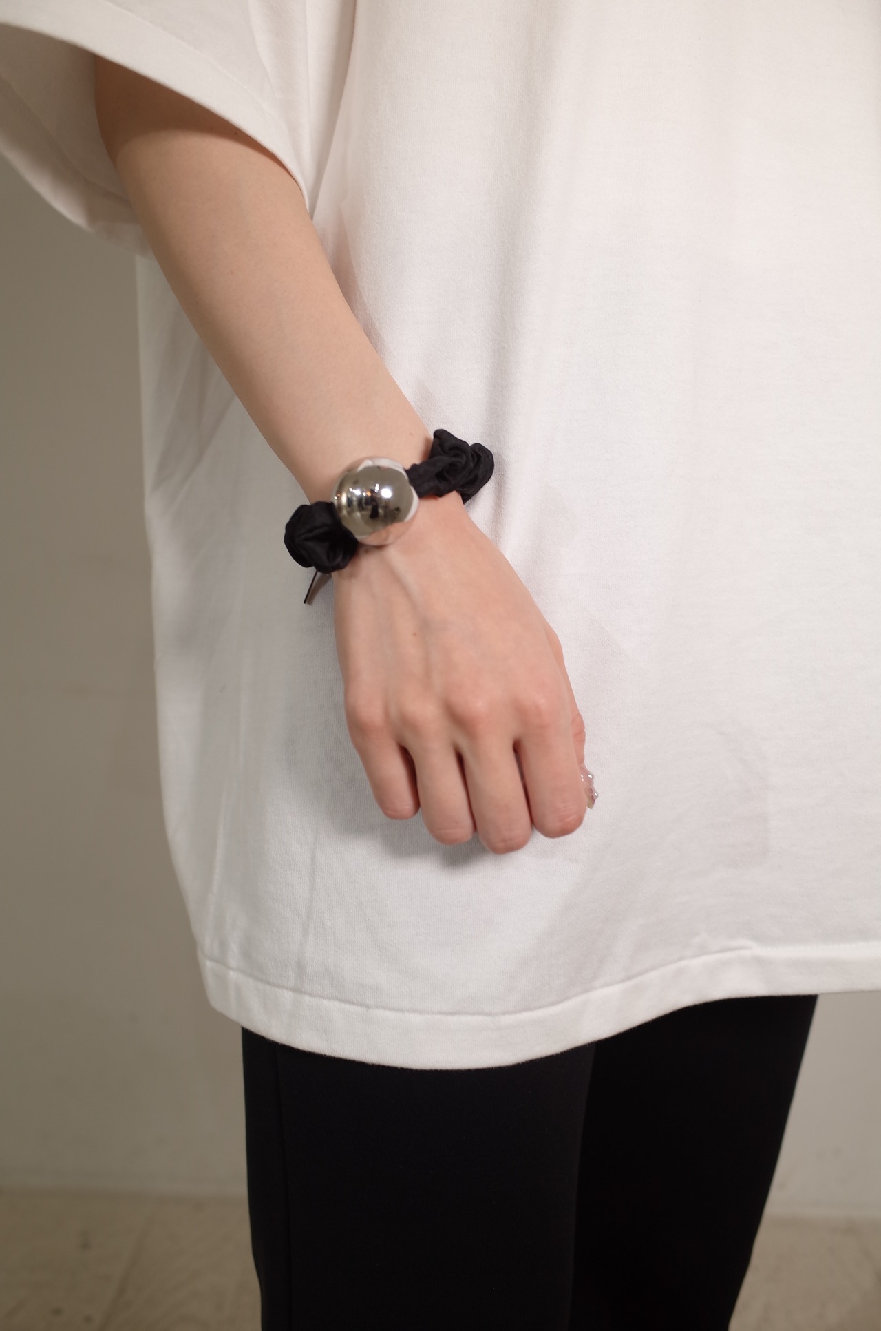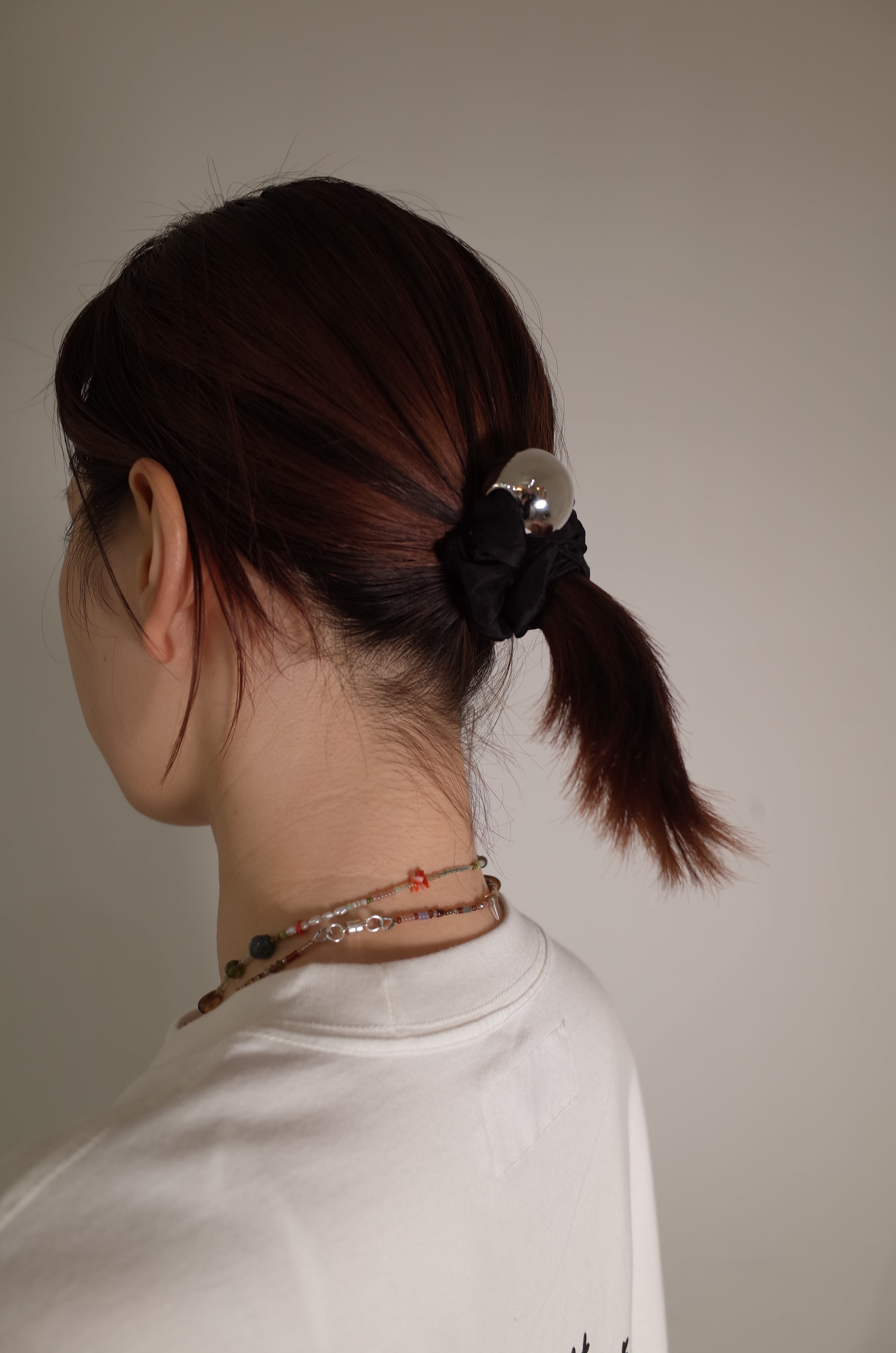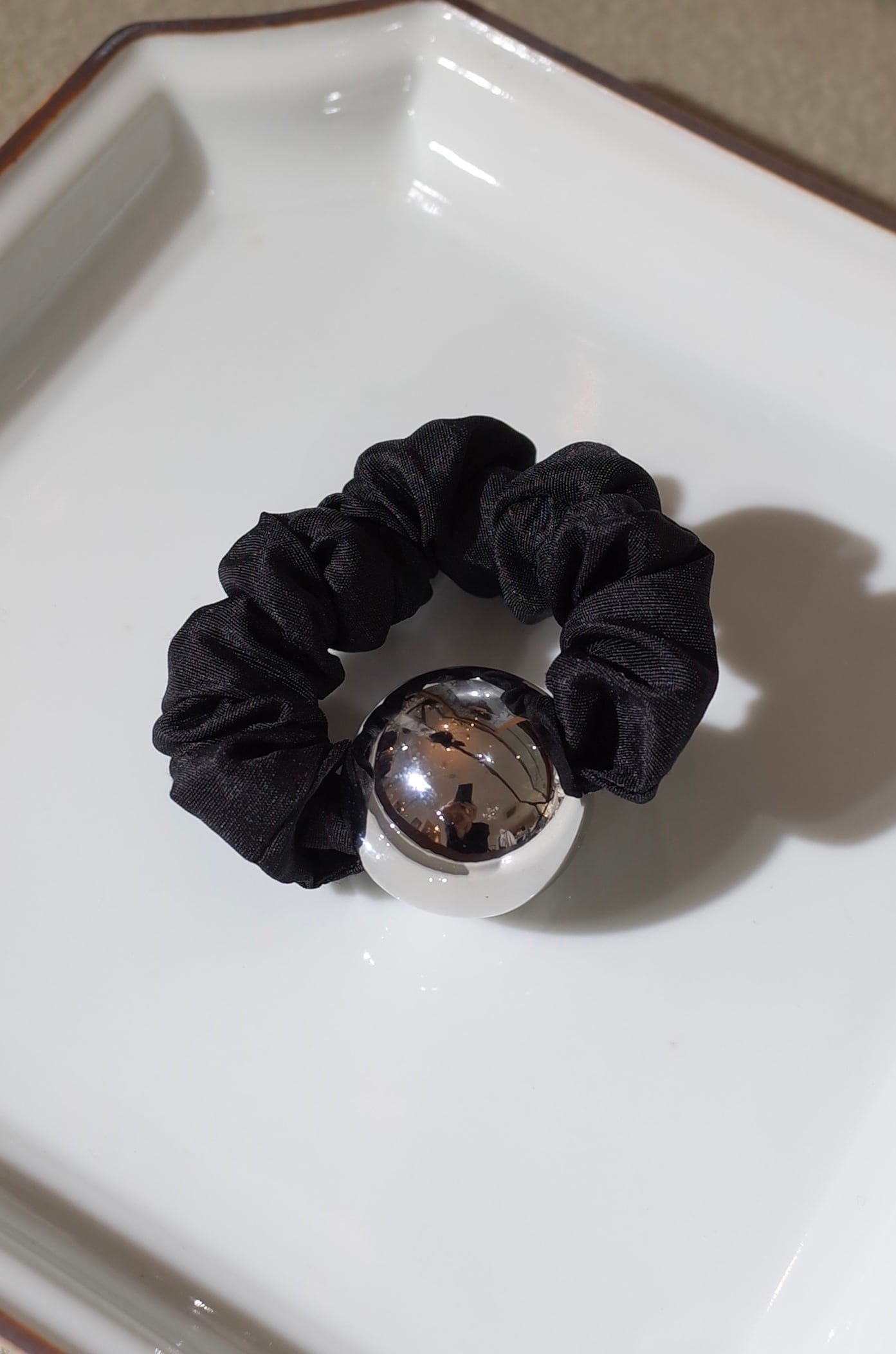 存在感のあるシルバーのメタルボールがアクセントのシュシュ。