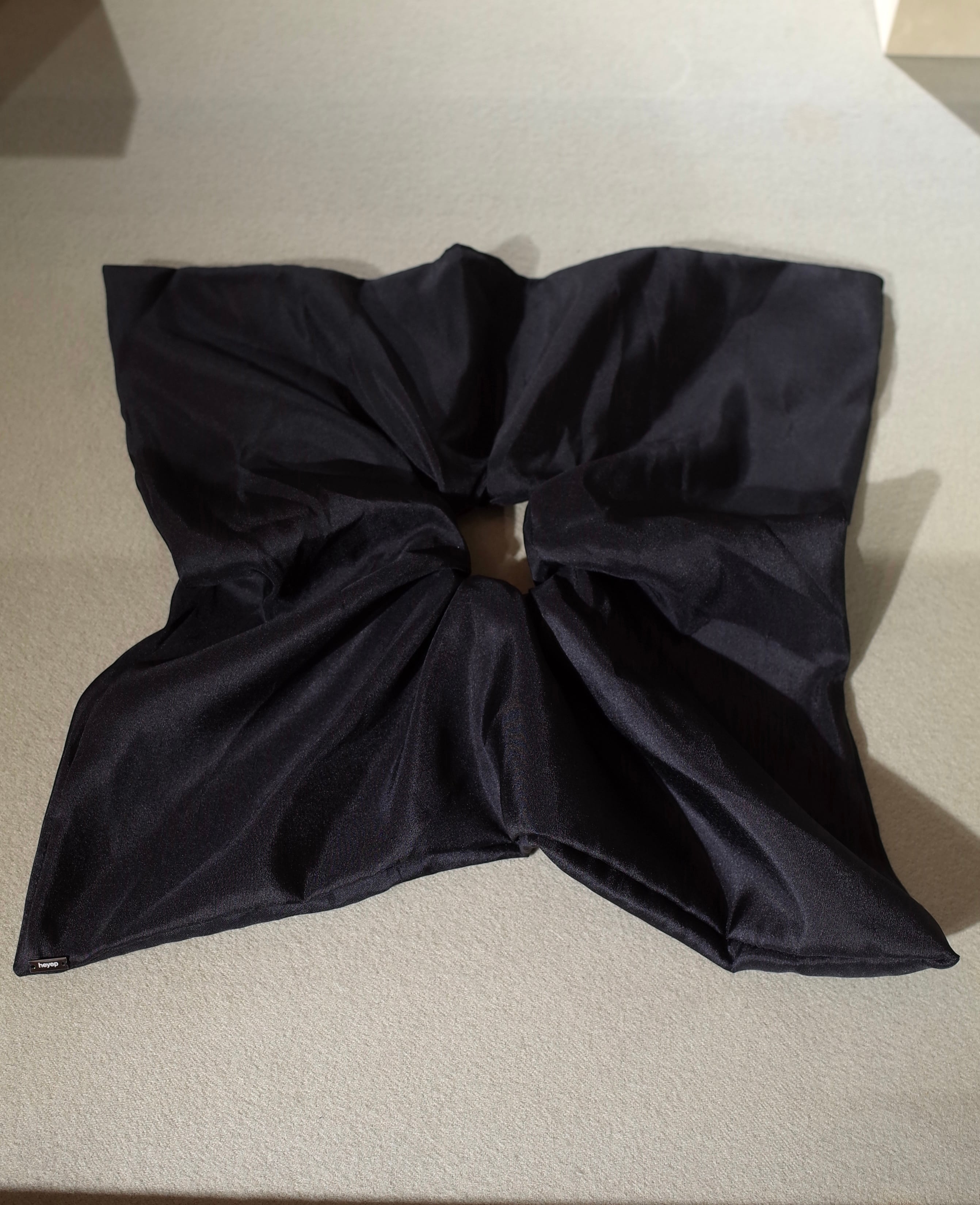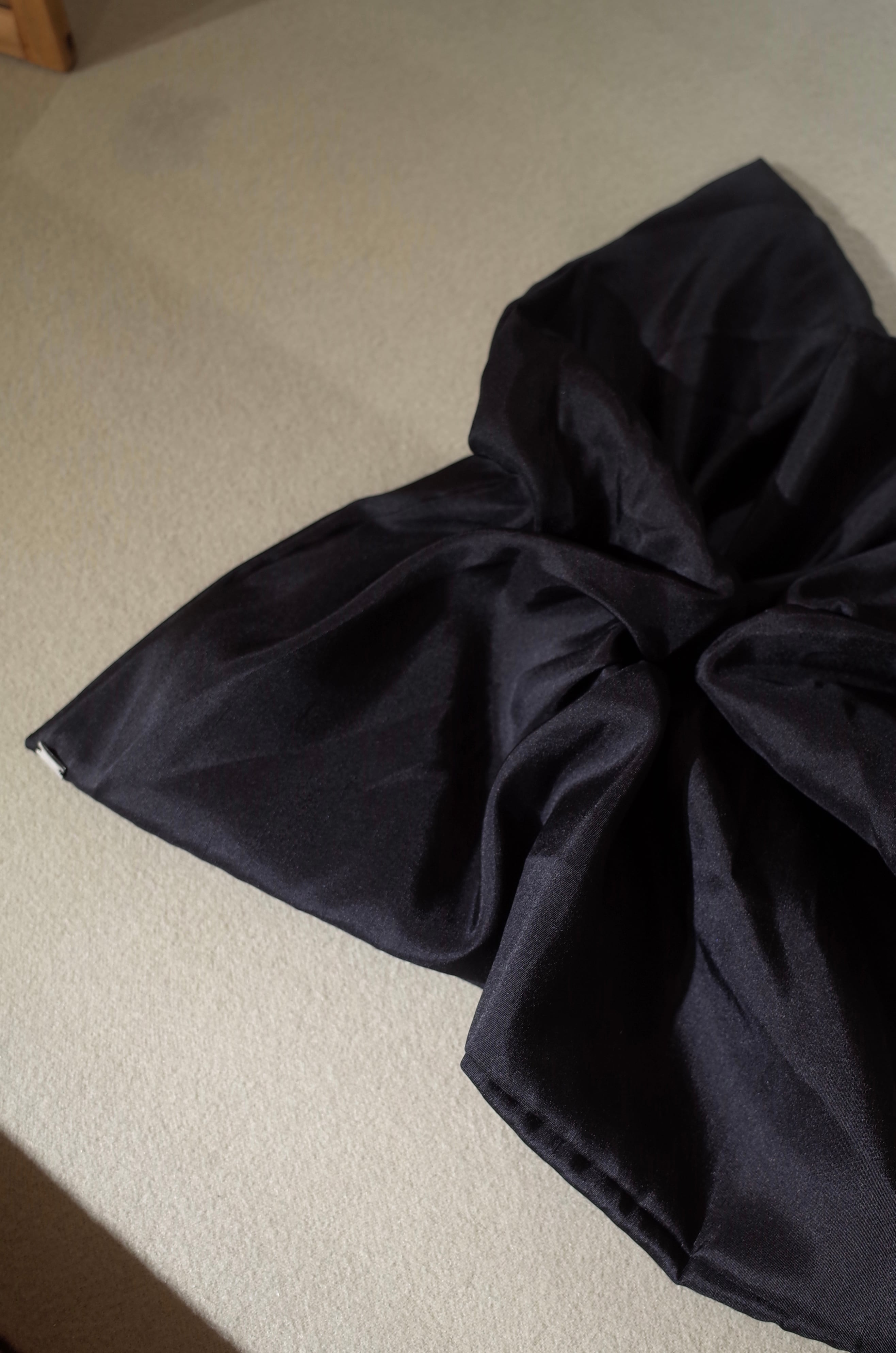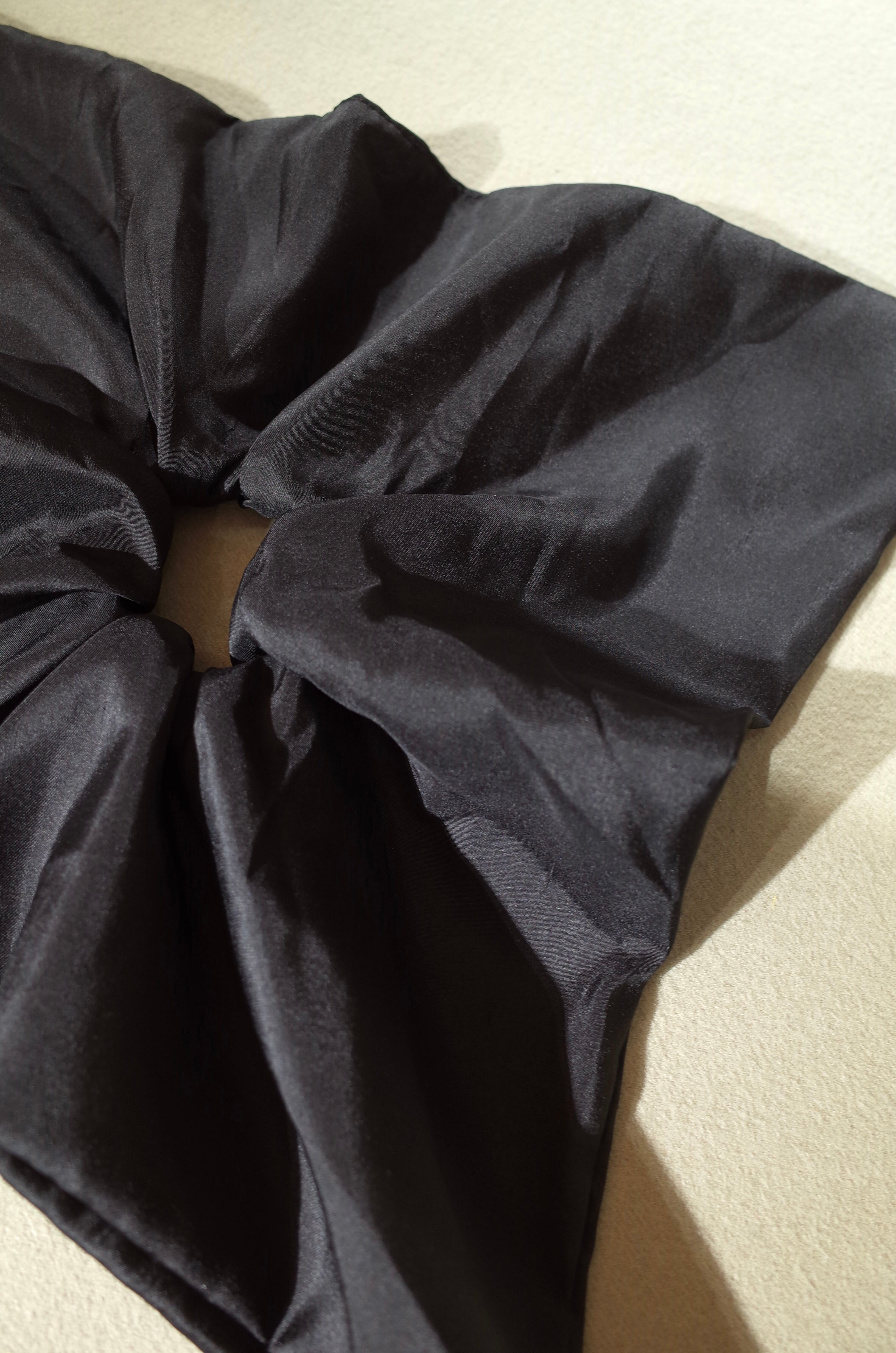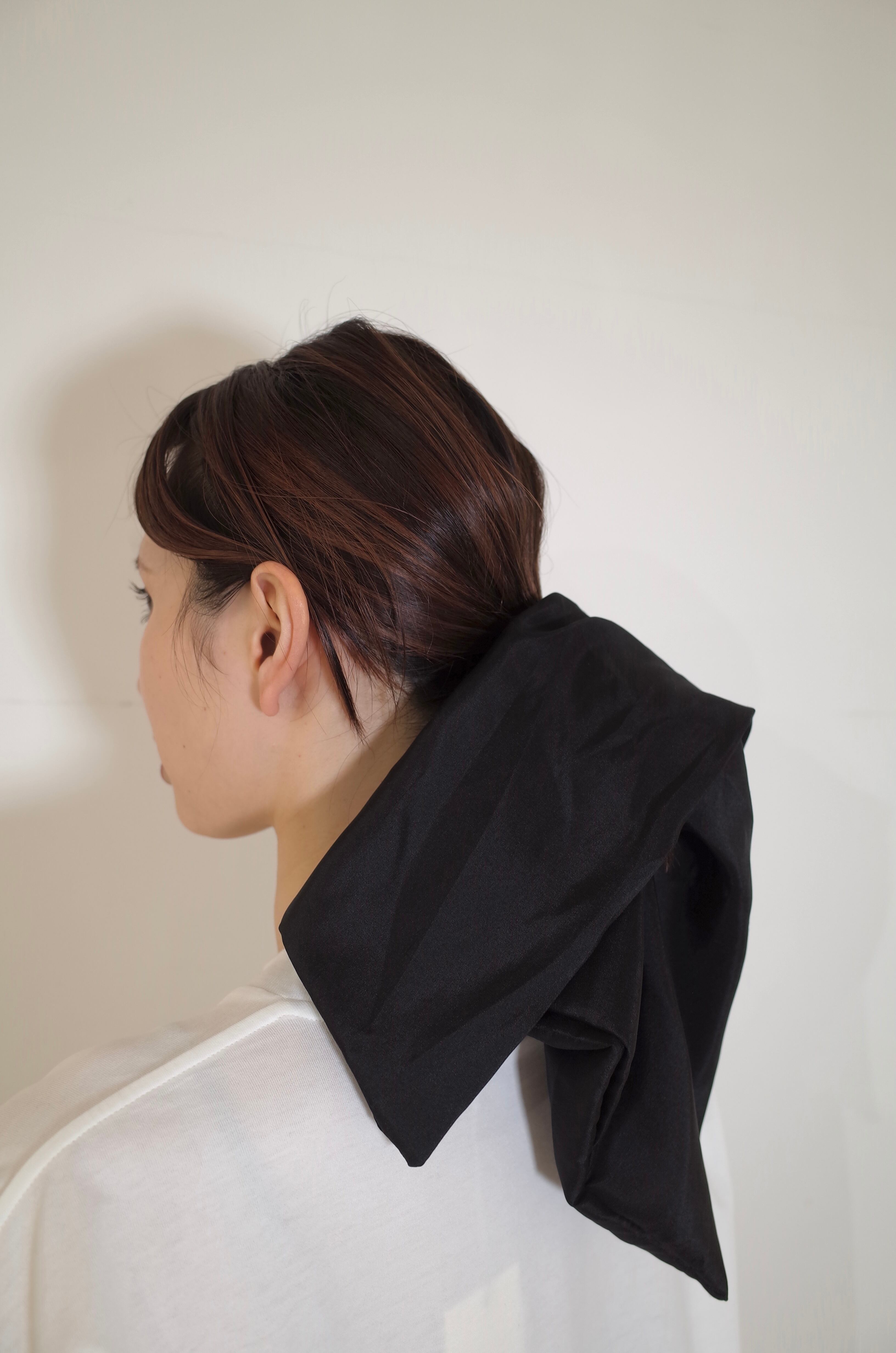 ラージサイズのスクエアシュシュは、スクエアの生地が折り重なって、リボンのような印象的なバックスタイルに。