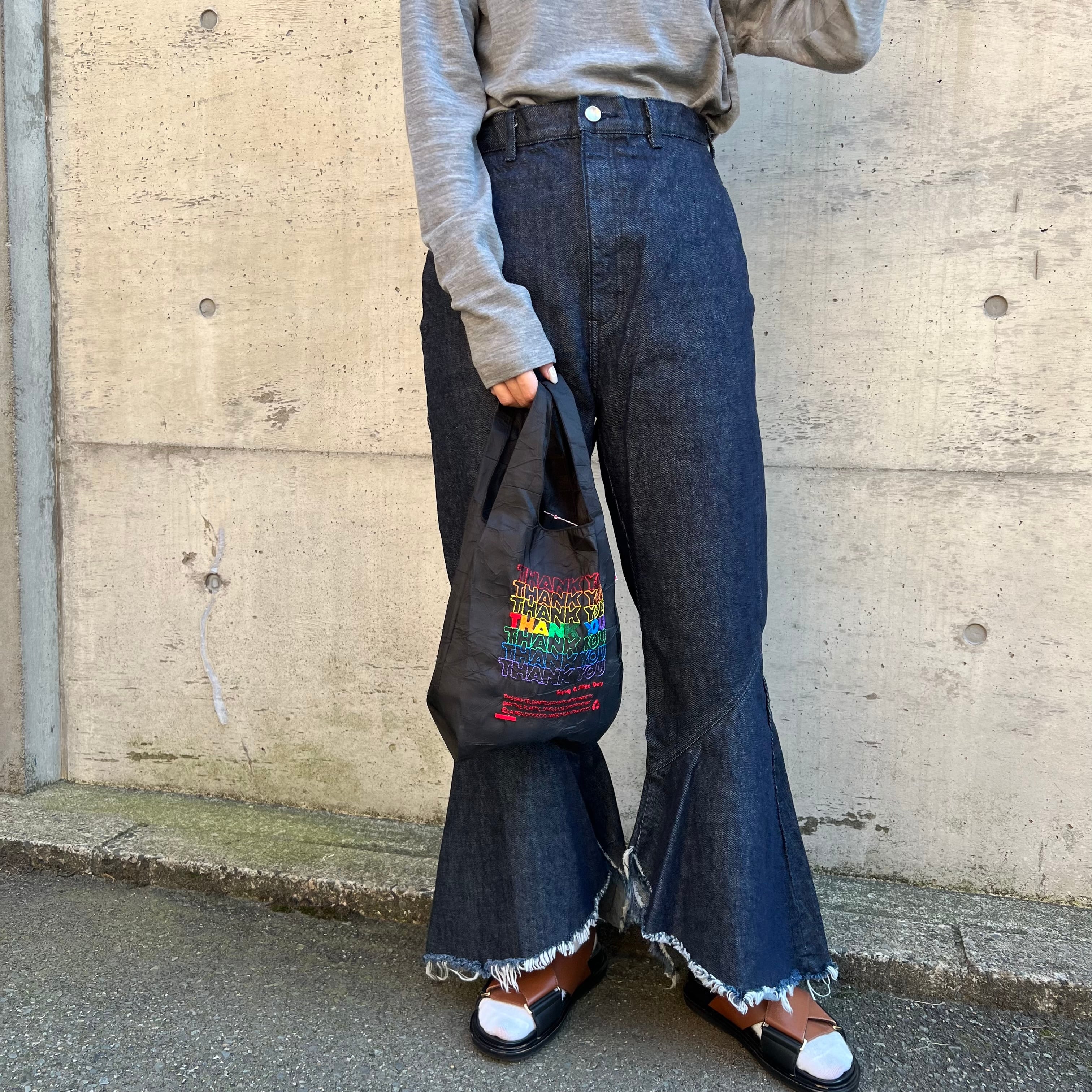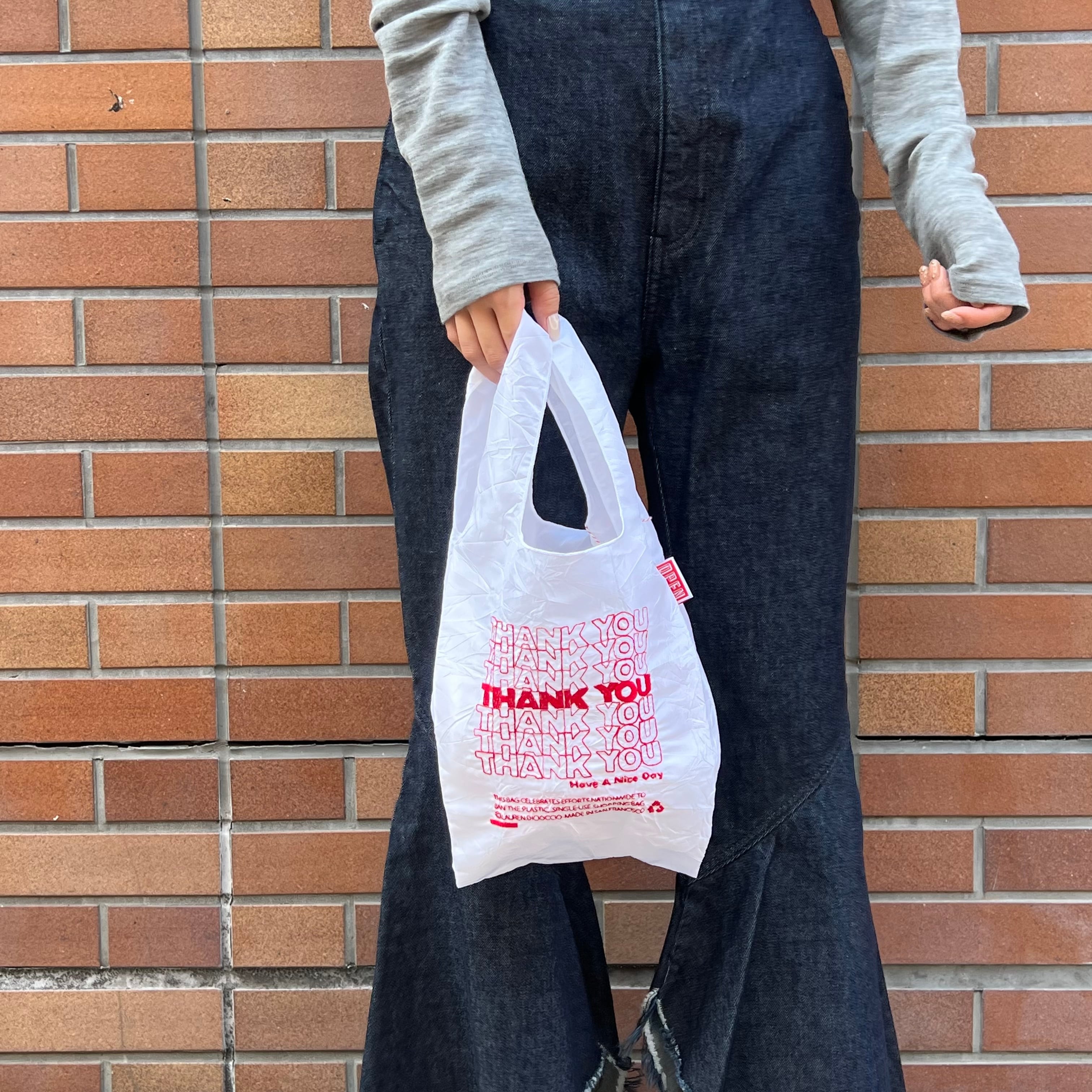 「Thank you tote( サンキュートート)」は、アメリカのグロッサリーやマーケットなどで使われているビニール袋のデザインをそのままポリエステル素材でバッグにしたもの。
