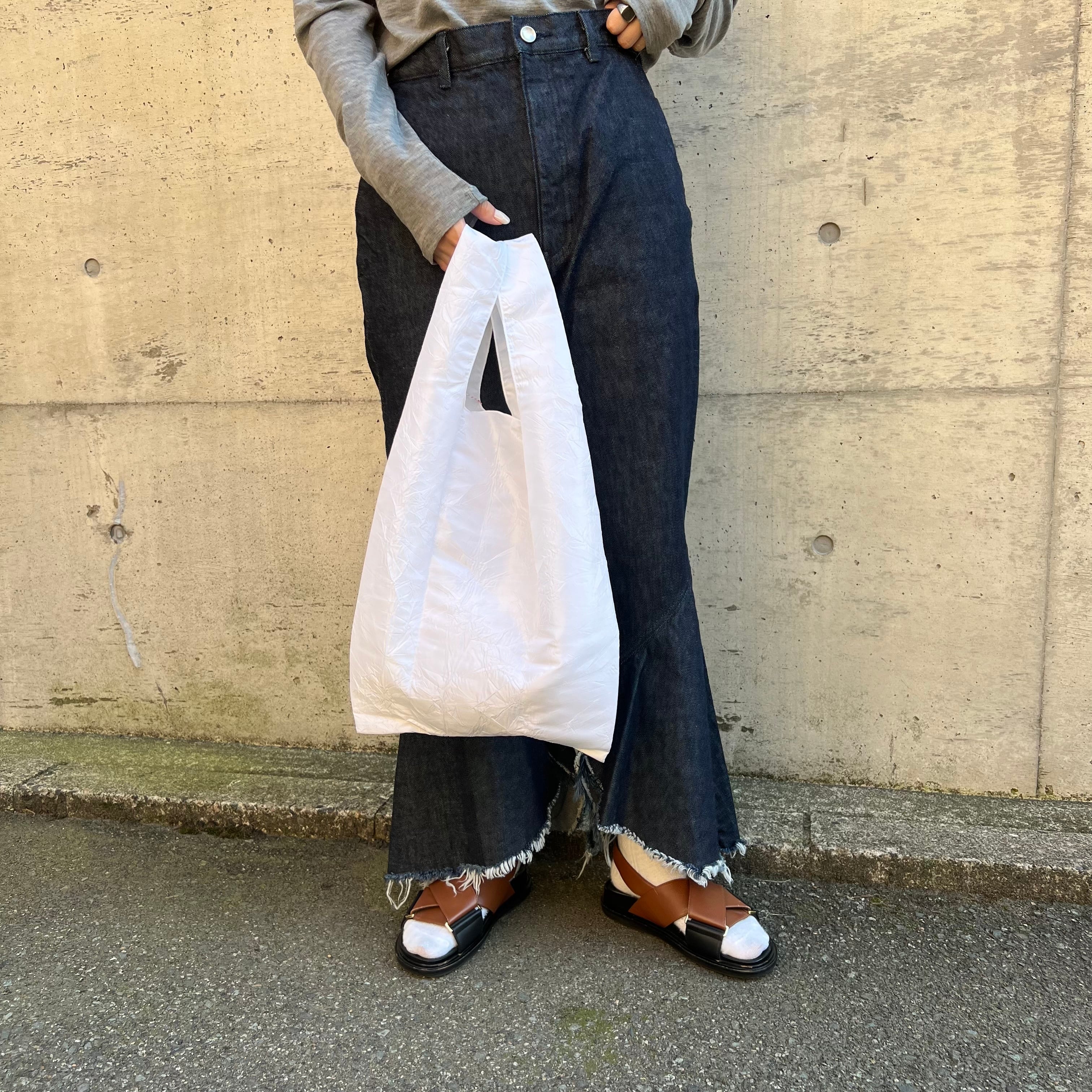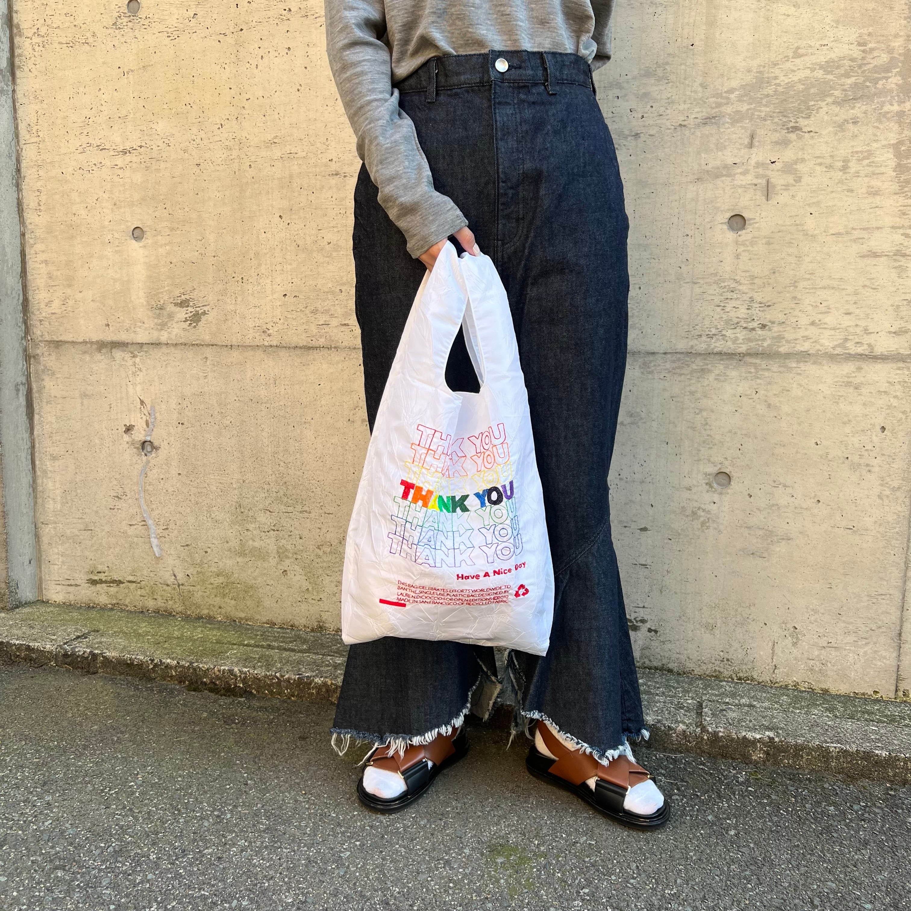 「Thank you tote( サンキュートート)」は、アメリカのグロッサリーやマーケットなどで使われているビニール袋のデザインをそのままポリエステル素材でバッグにしたもの。